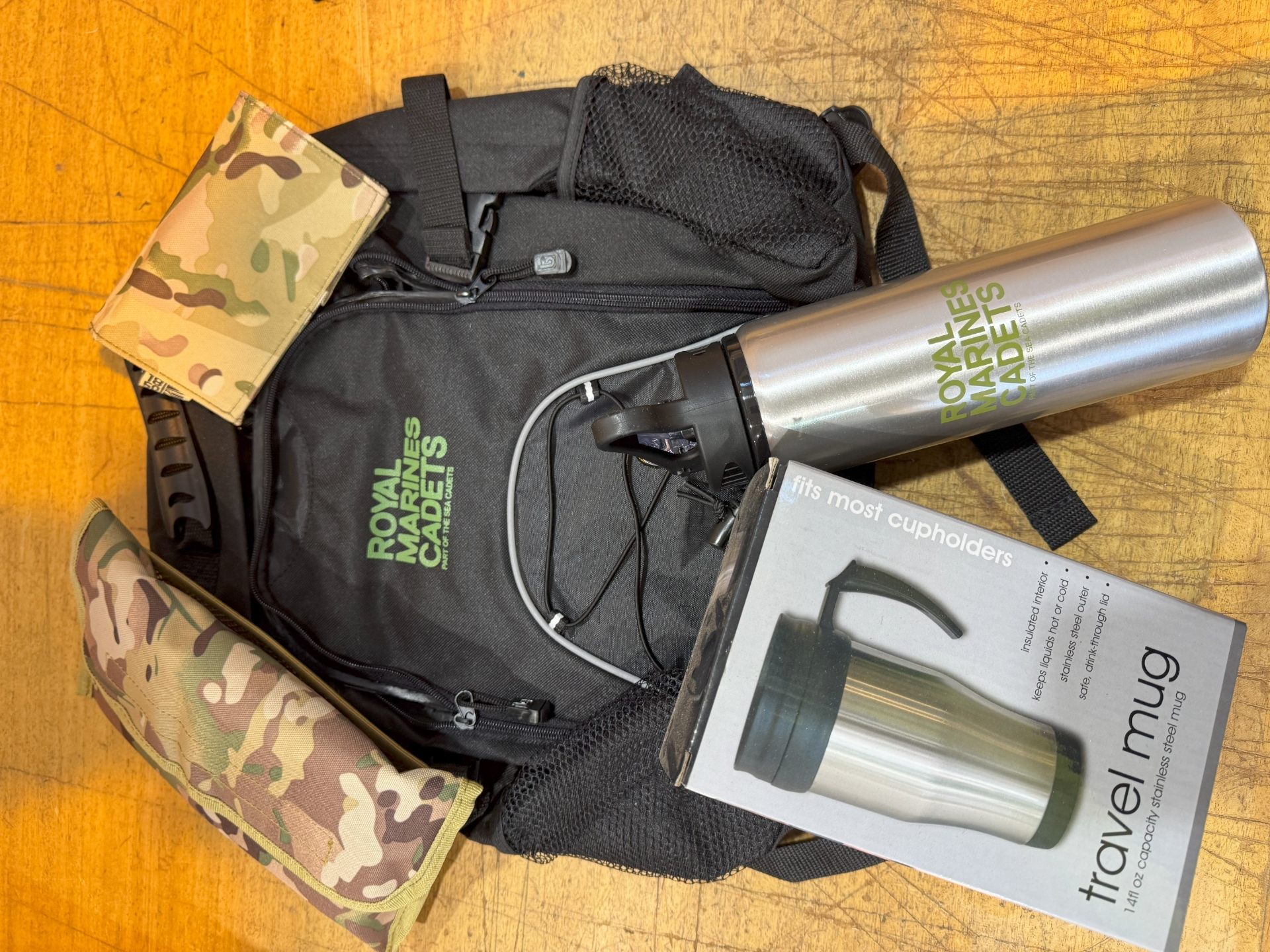 An equipment starter pack for RM Cadets, consisting of an RMC Branded Back Pack, a Sewing Repair Kit, a boot/shoe polishing kit a thermal mug and an metal cold drinks bottle. All in one bundle for £35 with a significant saving over purchasing separately.
